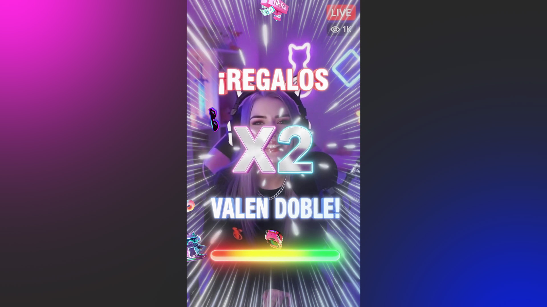La Animación Regalos X2 es un video en formato WEBM con fondo transparente pensado para tus batallas de TikTok Live cuando se activa la función de regalos por puntos dobles.